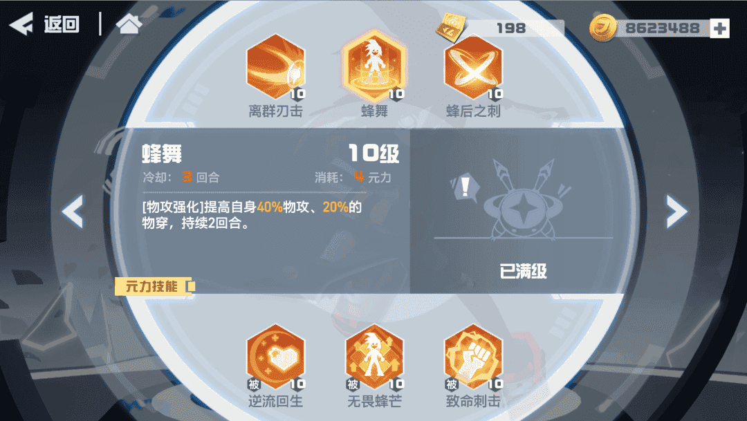 提高自身22%(40%)物攻,11%(20%)物穿,持续2回合。