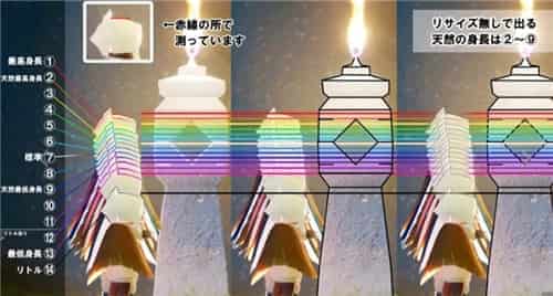 上图则是更为直观的猛一身高图,初始发型的平头部分,达到了烛台长方形的最高水平线。如果是猛二的话,只能达到下面的那条刻度线上。当然,除了官方的猛一之外,还有猛0这种变态身高,要极好的运气才能刷出来。